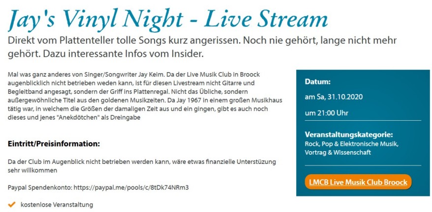15. Mai 2020: Jay's Blues, Soul, Pop Retro - online Vortrag. Thema: wie alles begann . Technisch etwas entgleister Livestream, welcher von Youtube wegen angeblichem Rechteverstoß abgewürgt wurde.